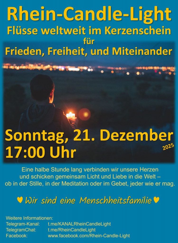 In einer Zeit zunehmender internationaler Spannungen, militärischer Eskalationen und einer immer schärfer werdenden politischen Rhetorik versammeln sich am Sonntag, dem 21. Dezember 2025, um 17:00 Uhr Menschen in ganz Deutschland und darüber hinaus: Am Rhein sowie an vielen weiteren Flüssen, Seen und Gewässern setzen sie für eine halbe Stunde mit einer Kerze ein sichtbares Zeichen für Frieden, Freiheit und Miteinander.
